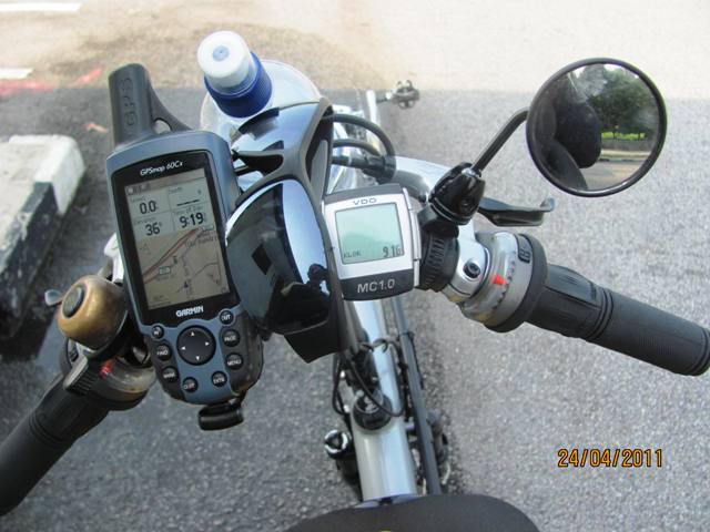 Handlebar mount includes Garmin GPS,cateye bell,cyclometer , rear mirror and water bottle